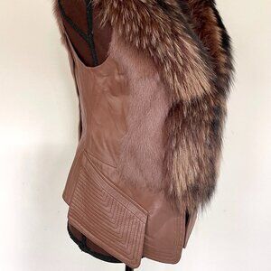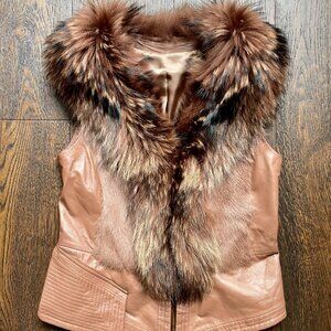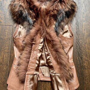 NWOT Tan Brown Leather Vest Real Fox Fur XS size