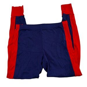 ⢠Coordinating red-and-blue jogger-style bottoms with cuffed ankles