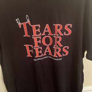 NWOT Tears For Fears 'The Tipping Point World Tour 2022' shirt in adult size XXL, featuring a black color theme. This original music memorabilia piece is perfect for fans of the rock and pop genre, specifically those who appreciate the music of Tears For Fears. With its exclusive design and high-quality construction, this shirt is a must-have for collectors and enthusiasts of music memorabilia.