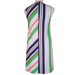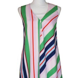 This sleeveless tunic "Bay of Honor" dress by Ted Baker is made of a lightly textured 92% polyester and 8% elastane fabric and is fully lined with a 100% polyester lining. The print features a vertical and diagonal striped print in pink, blue, red, and green. The lining is pink. There are a couple of deep and long pleats below the v-neckline that add the the flowy/swing look to the dress.
