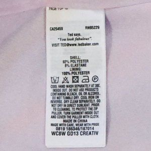 Although the "Ted Baker London" information and fabric care instructions are present on the side label, the main label says "Ted Baker London" that was on the back of the neck has been cut out. All of the Ted Baker dresses I bought in the lot had that designer label on the back neck removed.