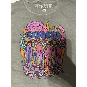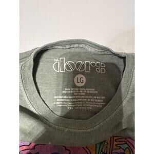 Features/Description: Green dyed t-shirt with a vintage look. Front of the shirt has colorful The Doors graphics on it. Shirt is cropped.