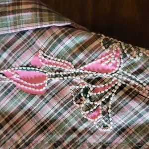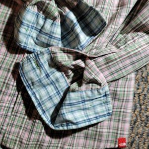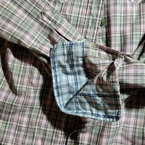 Contrast pink and green plaid fabric at cuffs and neck