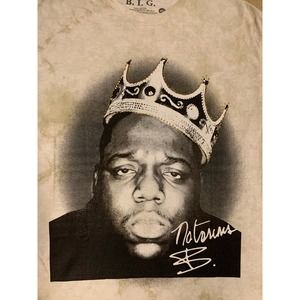 Features/Description: Shirt is a tan/white tie dye t-shirt. Front of the shirt has a Biggie Smalls BW photo with a crown. The crown is outlined in gold rhinestones.