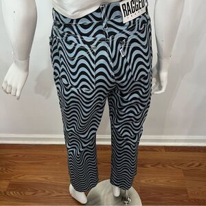 The Ragged Priest originated in customized denim and are a leading denim authority. These high rise Mom jeans are a cult classic and feature a straight leg and a bold blue and black wave print. Ragged logo on back.