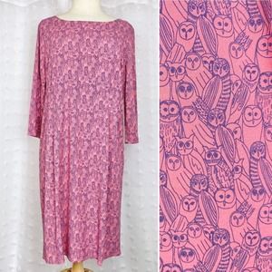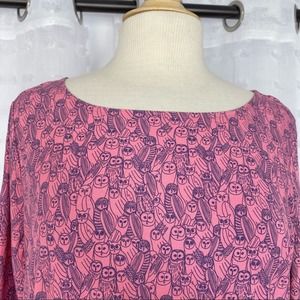 NWOT The Savile Row pink owl print shift dress. The cutest print of all kinds of little owls cover this dress! 3/4 sleeves with a notch detail, wide rounded collar, pleating at the waist. A very simple silhouette that could also be accented with a belt. Marked a 6. Measures (flat, unstretched, approximate): armpit to armpit: 20.5in, waist: 20in, hip: 20.5in, shoulder to hem: 38in, sleeve: 17in