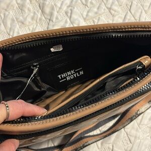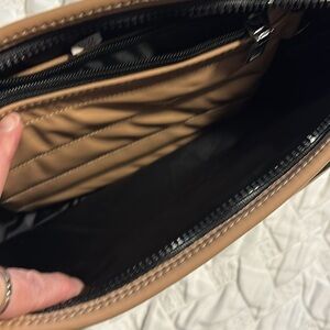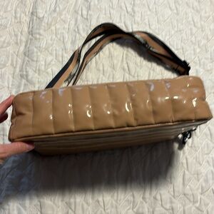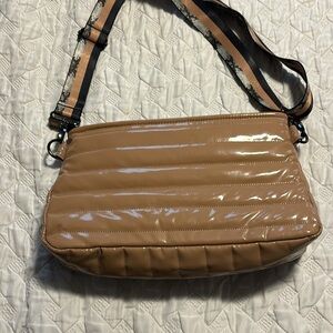 Aprox 13.5 wide by 7.5 tall. Tan color with multi color strap. Greta basic neutral bag.