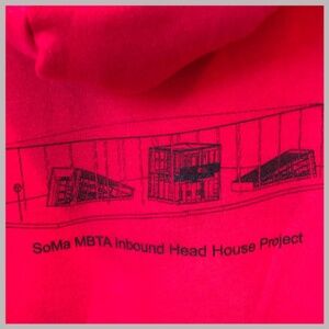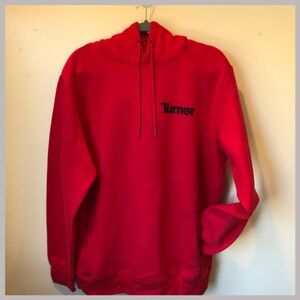 A red hooded pullover sweatshirt with a front pouch pocket and drawstring hood. Black silkscreen graphics on left chest and back of garment.