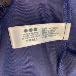 NWOT Three Dots Stretch Panne Velvet Blue Black Lace Short Sleeve Top, Small, NEW. In new condition without tags. Made in the USA 92% polyester and 8% spandex. Machine wash cold and line dry or dry clean. Loose fit with lace trim around sleeves and hem. Pit to pit, this top measures 20” across with darts at bust. From the back of the collar to the hem is 21” in length