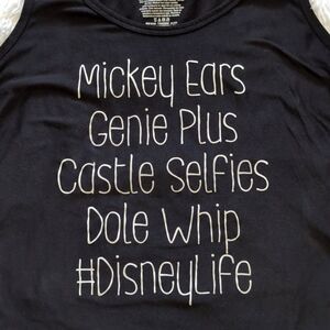 Black with white Disney-themed graphic: Mickey Ears, Genie Plus, Castle Selfies, Dole Whip, #DisneyLife