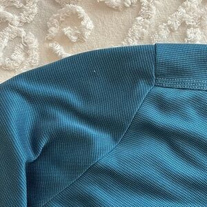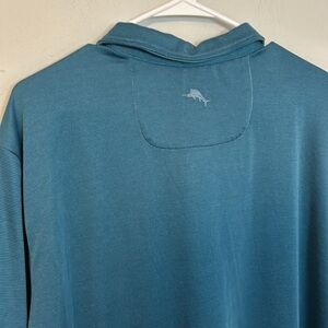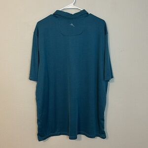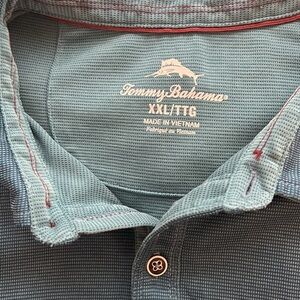 Tommy Bahama Shoreline Surf Polo, big and Tall XXL. Teal color, 85% Tencel, 25% Polyester. Collared, black and white buttons, short sleeve. Great condition, see photo of loose thread on arm. Small white dot.