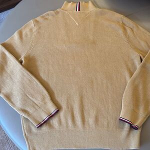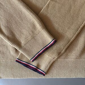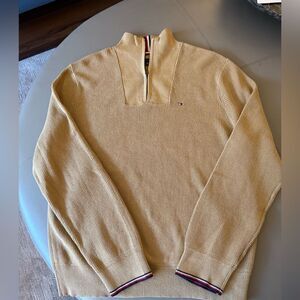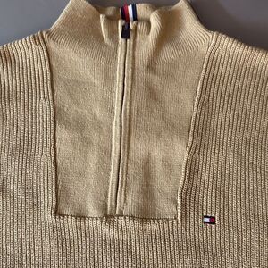 NWOT Tommy Hilfiger camel quarter zip long sleeve cotton sweater with red, white & blue tipping on cuff, inside of collar, and stripe on collar back. Bib detail around zipper closure. Mock neck and logo on left chest.