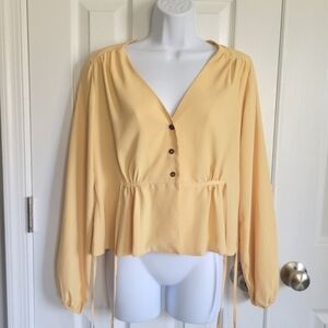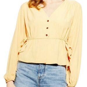 Light yellow Topshop long sleeve blouse with adjustable waist cinching ties for the perfect flattering fit. Tortoise shell color brown buttons and elastic sleeve cuffs.