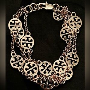 This Tory Burch Bracelet has a layered look of triple strand logo disc chains.