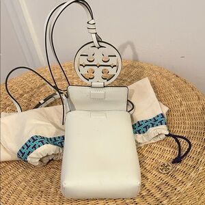NWOT Tory Burch cream crossbody phone case with iconic logo. Dark brown edging. Features a crossbody strap for easy carrying. Adjustable leather crossbody strap, outer pocket on back side, three credit card slots inside, and magnetic TB cutout insignia closure with long leather straps hanging from logo but can be removed. Gold tone hardware Very structural but has a bit of softness to leather as well. Great for any occasion, especially when traveling light! Will come with TB original dust bag Purchased from TB website but used so selling simply to make room in my closet. Reasonable offers welcome. Thanks for looking and sharing!