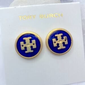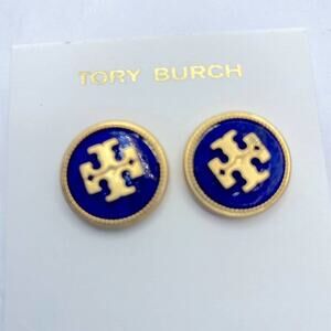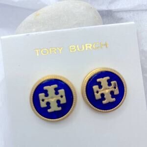 NWOT Tory Burch Gold Logo Dark Blue Medallion Stud Earrings