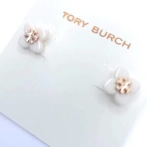 NWOT Tory Burch Gold Logo White Enamel Flower Stud Earrings