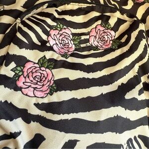 Stylish zebra print backpack with floral accents. Perfect for school or travel.