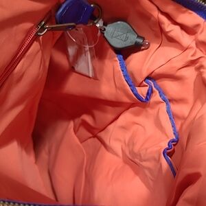 Soft outside shell with one zip pocket and 2 side pockets, zip closure, orange lining with zip pocket, other pockets, flashlight