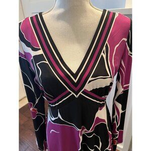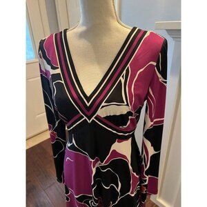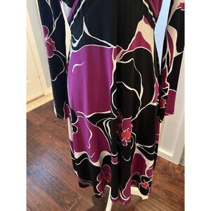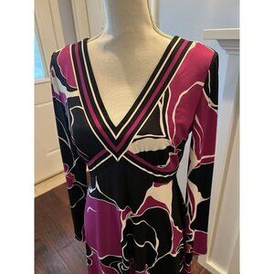 Beautiful, fun New Without Tags dress from Trina Turk. Great color combination of purple, black and white, empire crossover waist then flows over hips. Fabric feels great and fully lined. Long sleeves. Perfect for work or a night out! Women's size 8. 39" length, 18.5" pit to pit.