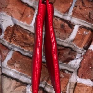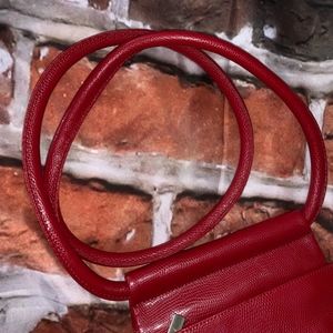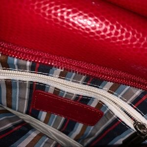 Beautiful New without tags Tuci Italia Reptile Embossed Red Leather Cross-body Shoulder Bag, MSRP $659.99. Features reptile skin embossed leather with silver tone hardware, fold over bag with top zip and magnetic snap closure, leather cross-body shoulder strap, front Tuci Italia embossed signature logo print. Interior is lined with a multi-color stripes fabric and has fold-over front zip and back magnetic snap compartments. Back compartment has full length zip pocket.