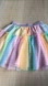 Has pink shimmer elastic waist. Colorful tulle skirt with a rainbow design. Lined.