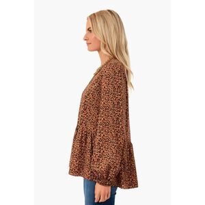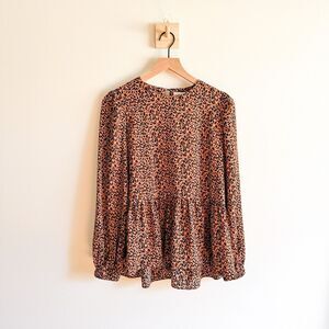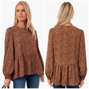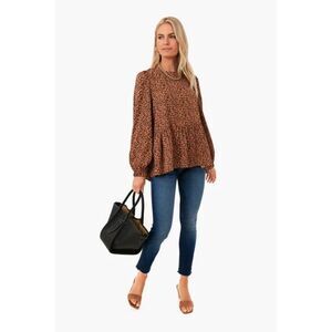 Tuckernuck Pomander Place Leopard Carlota Peplum Blouse in Brown. Flowy and flattering, the Carlota Peplum Blouse is a wardrobe must-have. This top features puff sleeves with elastic wrists, keyhole button back closure, high-low silhouette, and a peplum hem detail. Pair with denim and a change of accessories for a look that will take you from desk to drinks! The details: Crew neckline, Long puff sleeves, Elasticated cuffs, Keyhole back with button closure, Peplum hem, & Slightly longer back hem. In excellent like new condition. No holes, rips, or stains. Ours is a smoke free home.