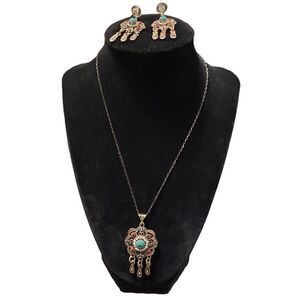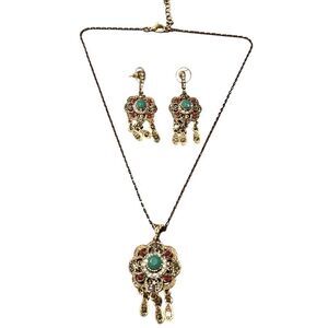 NWOT Turkish design set chain necklace and dangle earrings. Brass color. Base metal. Acrylic red and green stones.