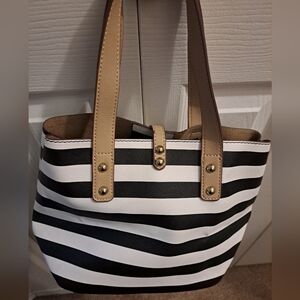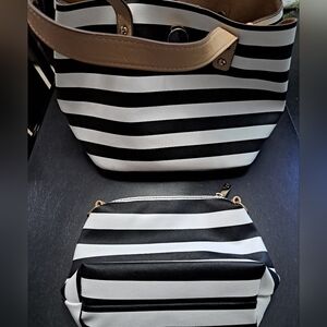 new condition, black & white striped bags, the larger is 13"×8.5", the smaller is 9"×6", the smaller bag snaps into the larger & has a zip closure, the larger has handles & can be used as a tote
