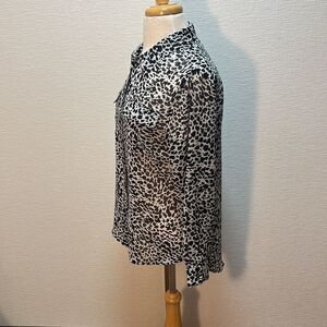 Stylish leopard print button-up blouse. Features a classic collar and long sleeves. Perfect for any occasion.