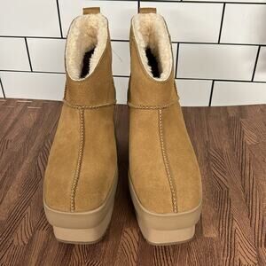 NWOT UGG New Heights Platform Mini Boots Tan Suede Sherpa Women’s Size 8.5