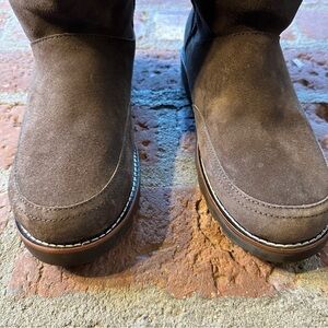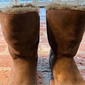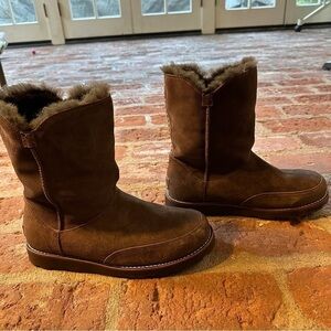 NWOT UGG size 10 chocolate braided short boots in excellent condition. New without box, worn around the house to try on. Tufts of tonal genuine shearling peek out from the top of a low suede. The foam cushioned footbed is layered with UGGplush, a moisture wicking textile made from a wool rich blend but crafted to feel & wear like genuine shearling. Treadle sole provides lightweight stability. pull on style.