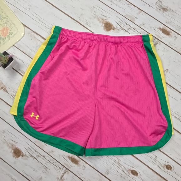 NWOT UNDER ARMOUR Pink Green Yellow Heat Gear Mesh Workout Campus Shorts, Medium. Excellent condition, no flaws or signs of wear. 100% polyester with comfy thick elastic waist. Inseam- 6".