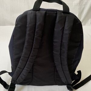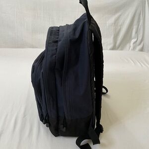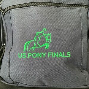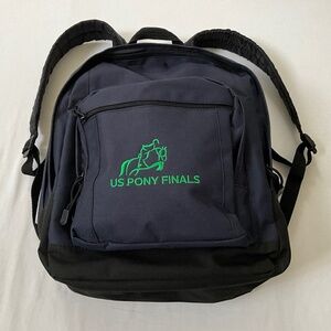 New without tag. Port & Company large, nylon canvas backpack in dark navy blue and black, with US Pony Finals logo embroidered in green. Adjustable padded shoulder straps. Two full size interior compartments with dual zippers for opening/closing in either direction. Two zippered pouches on front. The larger one has dual zippers and a zippered mesh pocket inside. The smaller one (with logo) has single zipper. The backpack was never used, but has been moved about and boxed up over the years. At some point it sustained two small cuts on the bottom, or it may have been like that when we got it. These have been mended- I went a little overboard on the mending to ensure that the fabric edges didn’t fray down the line (see last two photos). No other flaws found. May have light marks, dust or lint from handling. Measurements in photos. Cross listed under Kids due to relevancy.