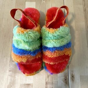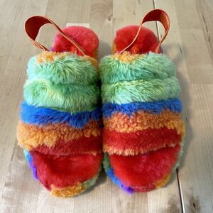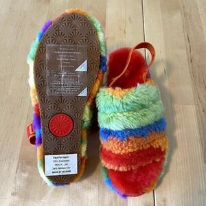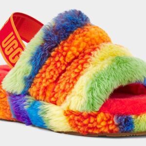 NWOT Ugg Womens Fluff Yeah Slide Cali Collage Rainbow Pride Slippers Sz 7