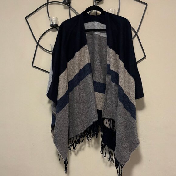 Cool minimalist quiet luxury blue and heathered grey soft shawl with tassel fringe
