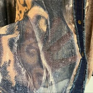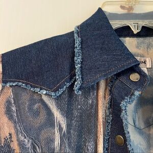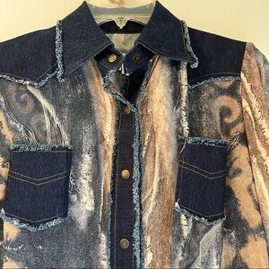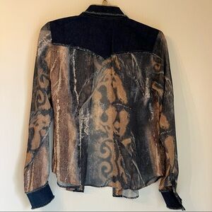 NWOT Unique Sheer Denim Western Shirt Size 4 Distressed Print Snap Front Blouse