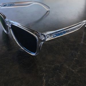 New without tags Unisex Oakleys Frogskin , NOT polarized but reflective look. Cannot see eyes when wearing these. Never worn, were a gift to me. Perfect condition from Oakley store. Clear with blue letters and blue reflective lenses