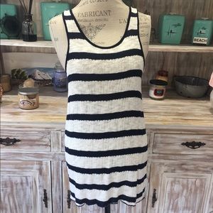 Navy blue and ivory striped loose-fitting knit tunic. Open back closed with a twist. Could also fit small for an oversized fit.