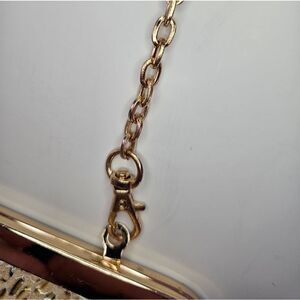 This stylish crossbody is perfect for busy ladies on the go. It's made from vegan leather and features a snakeskin pattern and snap frame closure. The gold hardware details add a touch of luxury. Inside, you'll find a gold satin lining and small zip compartment so you can keep all your essentials organized. The detachable, adjustable strap makes it easy to carry. Whether you're running errands or meeting friends for coffee, this bag is perfect! This is in excellent condition. Like new.