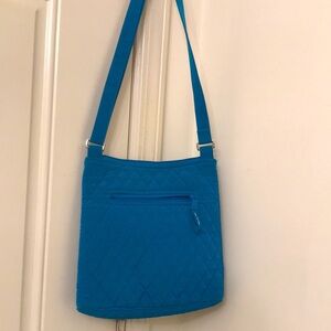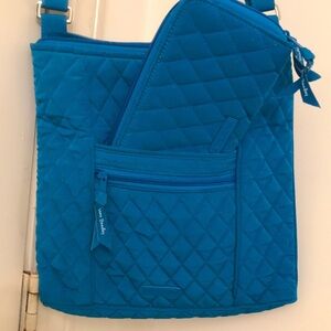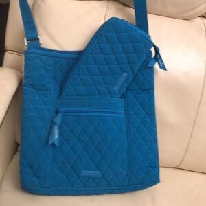 NWOT VERA BRADLEY blue quilted crossbody purse. Adding in matching wallet. Long adjustable crossbody strap. Beautiful bright solid blue color. Inside has 3slip pockets and printed roses in pink on super dark navy blue backround. A slip and zipper pockets on front. One zippered pocket on back. This bag has plenty of room inside. Measurements are shown in pictures. Wallet matches same colors and is a complete match. It has never been used. It is NWOT