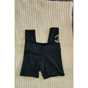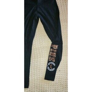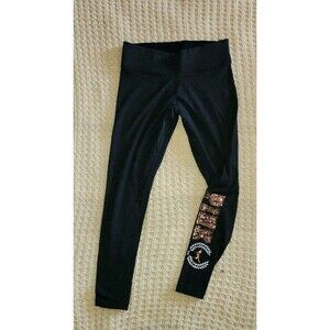 The product is a pair of NWOT Victoria's Secret Pink high waist cotton leggings in size M with a gold dog logo. These leggings are perfect for travel, activewear, and casual occasions, featuring a solid black color with a dark fabric wash. Made of blended fabric with an elastic waist for comfort and stretch, they are vintage style with a Y2K 90 theme. The leggings are adorned with the Victoria's Secret logo and are ideal for activities like gym training, yoga, and cross-training.