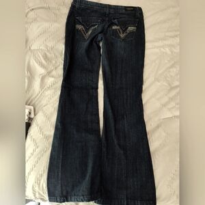 NWOT VIGOSS, dark blue denim jeans, size 5, with decorative, beaded back pockets. Mid- rise, Flare. Measures 15" waist, 8" rise, 29" inseam. Nice, dressy jeans! MSRP $78.