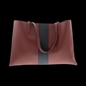 This stylish brown tote bag features a bold black stripe, perfect for any occasion. Its sleek design offers both functionality and fashion.