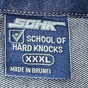 BRAND NEW WITHOUT TAGS ** VINTAGE ** RARE NEW OLD STOCK FROM THE 90'S MEN'S SOHK SCHOOL OF HARD KNOCKS EMBROIDERED DENIM JEAN JACKET. HOW AWESOME IS THIS VINTAGE PIECE...SO COOL!!! HUGE HUGE GOLD EMBROIDERING ON THE BACK WITH SMALLER EMBROIDERING ON THE FRONT. THIS IS HIP HOP STREATWEAR FIRE!!! SIZE IS XXXL MEASUREMENTS ARE 29 INCHES PIT TO PIT AND 32 INCHES IN LENGTH.