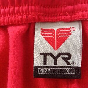 VINTAGE TYR RED JERSEY ATHLETIC / GYM SHORTS, SIZE "XL" (EST. FITS 34"-35"). Heavy material, sort of a Sweats material. These shorts have a custom "TYR" internal drawstring closure and front embroidered "TYR" logo. Great shorts for any athletic sports from running to intense gym workouts. Overall, 12" length and 3" inseam is shorter than many similar items.