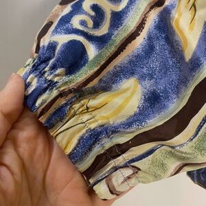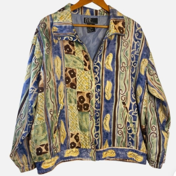 This vintage 80's/90's windbreaker jacket is full of color and style. Retro 80's/early 90's, pairs great with mom casual or business attire, and is great with for fall cool weather. 100% silk outer fabric with 100% nylon lining. Zippered front. Has two pickets on the outside.