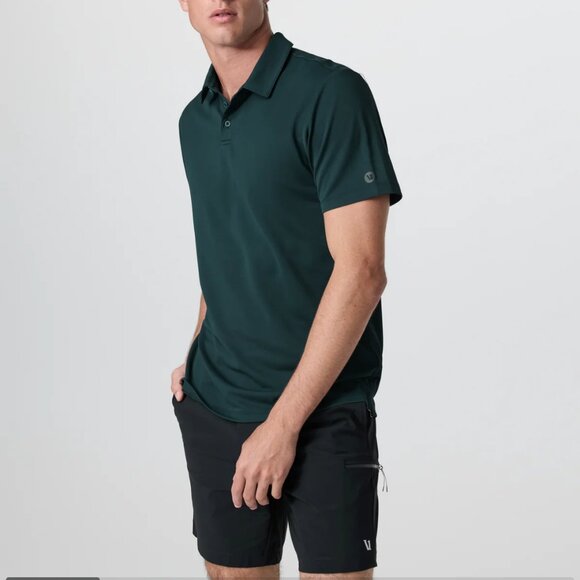Brand new without tags men's polo shirt from Vuori. This is the Gamepoint style in deep sea, a dark teal color. Made from a 100% recycled performance fabric with 4-way stretch. Made with tennis players in mind, but suitable for the office or the golf course as well!