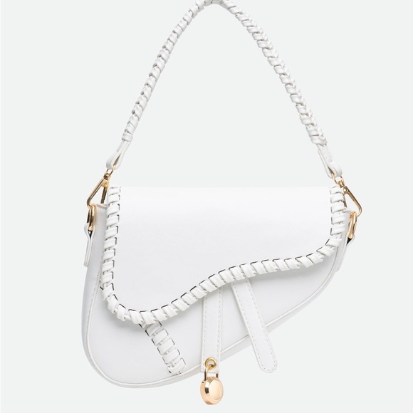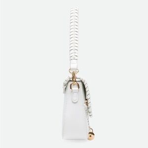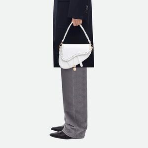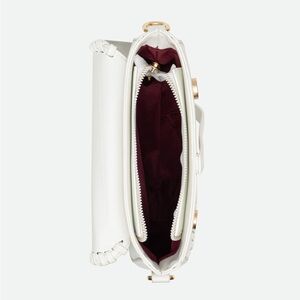 This chic mini bag features a saddle shape with a unique wavy trim detail on its flap closure, all in a pristine white color. The silver chain strap and gold-toned hardware add a touch of elegance, making it a versatile accessory for any occasion.