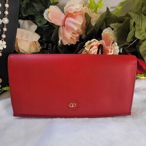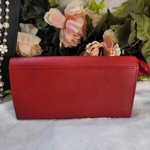 Beautiful leather wallet, new without tags. Stunning condition. Red leather with gold tone hardware. Unbranded Conversion Chain and charm added. There are tons of space and so many uses. Bifold flap with a snap closure. Zipper pocket, snap change pocket, 6 credit card slots, 3 slip pockets, and 2 pockets on either side of zipper pocket. There is also a pocket on the back of the wallet.
